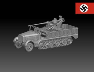 •歴史的背景:Sd.Kfz.7/2は、第二次世界大戦中にドイツ軍が開発・運用した8tハーフトラックで、後部に3.7cm対空機関砲Flak36またはFlak37を搭載した自走式対空砲です。1942年から生産が始まり、1945年の終戦までに約1000両が生産されました。